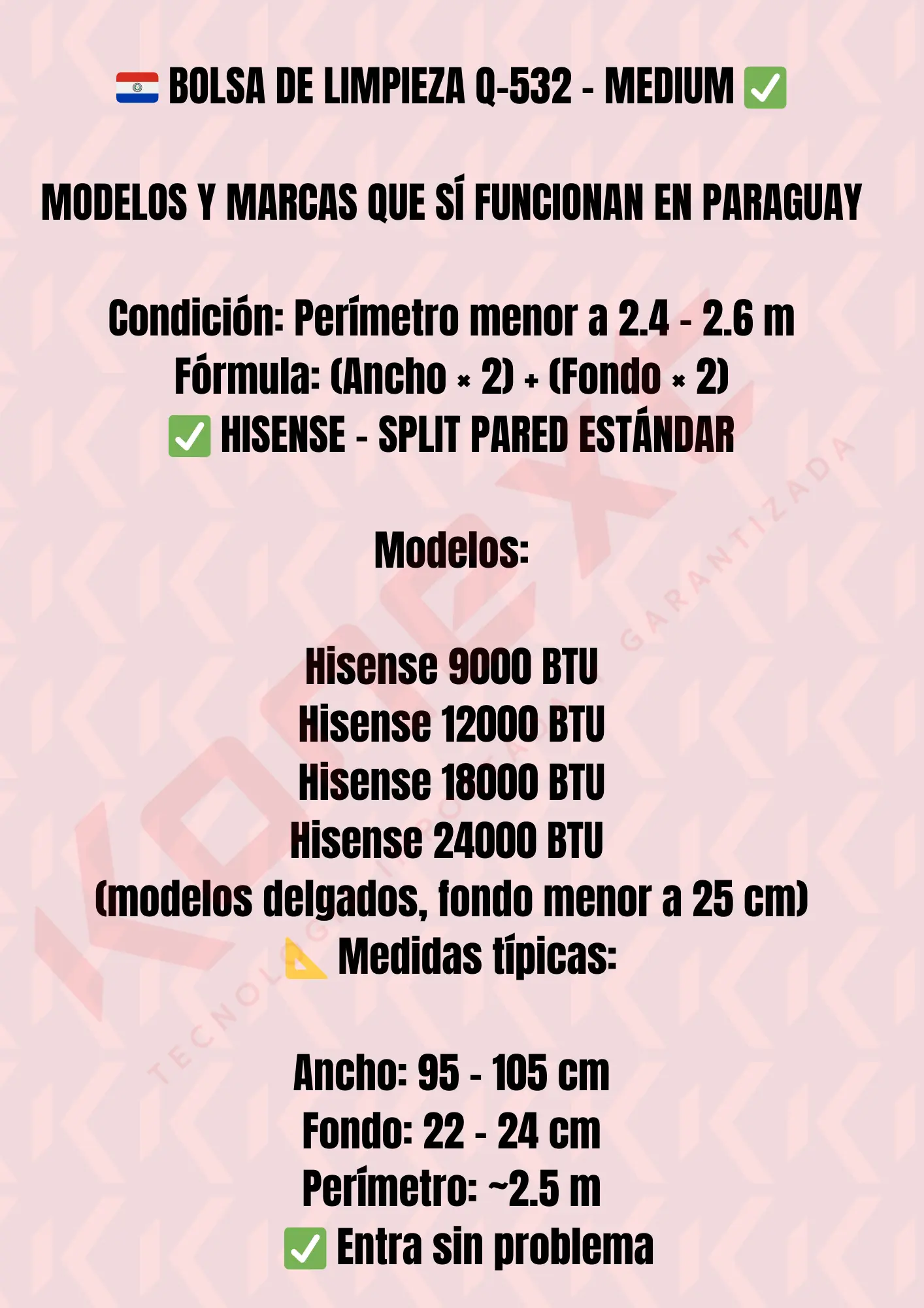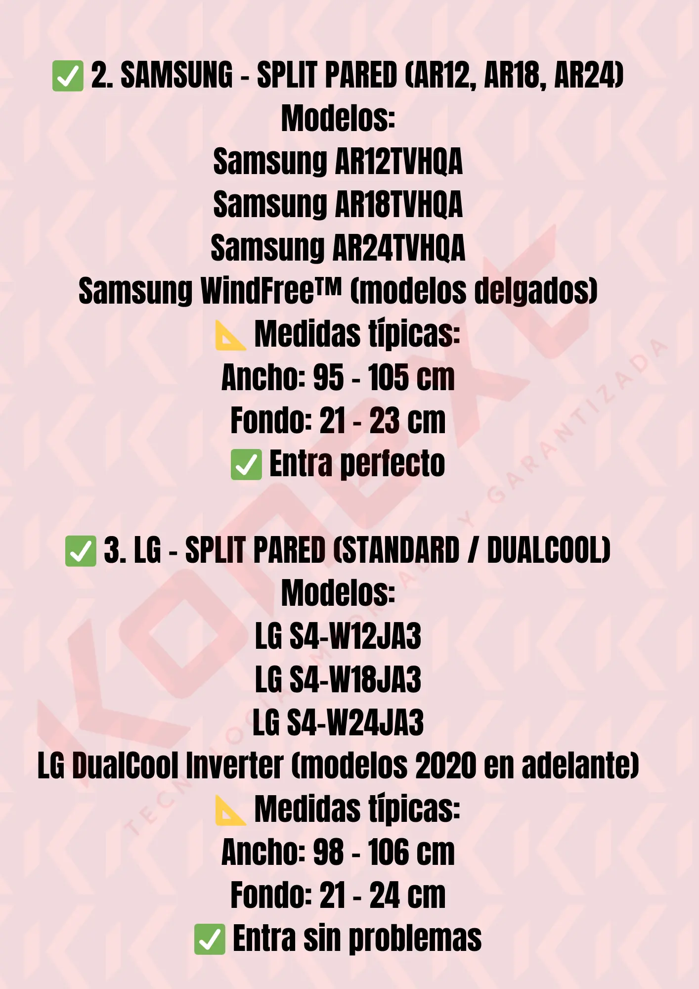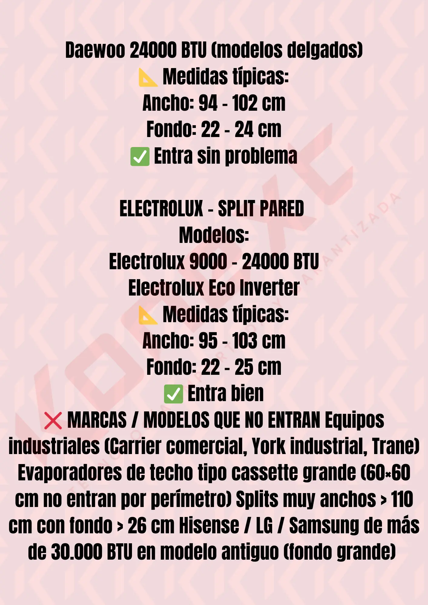 No compatibles: Equipos industriales, cassettes grandes (60×60 cm), splits >110 cm ancho y >25 cm fondo, unidades de piso/techo, modelos antiguos de 30.000 BTU con fondo profundo.