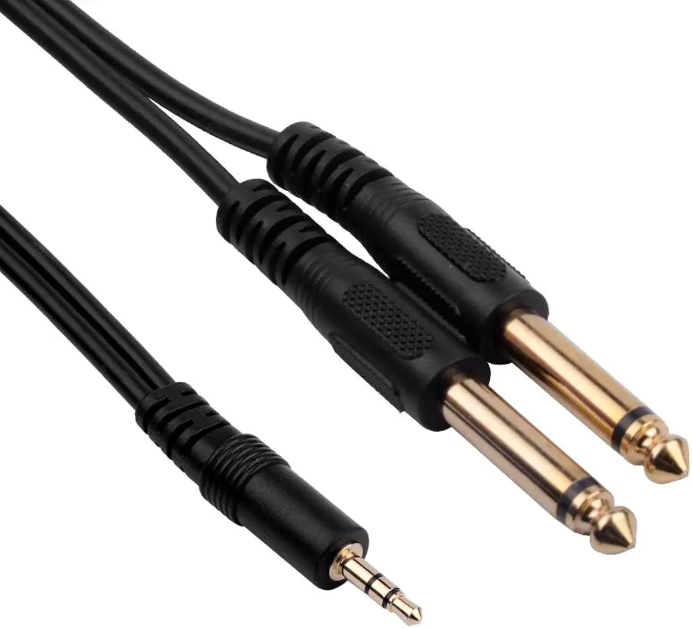 - Conectores de Salida: Dos conectores macho 6.35 mm (1/4″) TS (mono), usualmente identificados por colores (rojo para el canal derecho y blanco/negro para el izquierdo) para separar la señal estéreo en dos canales independientes.