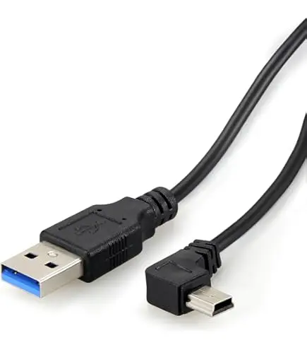 - Conector: Mini USB (tipo B de 5 pines) con un ángulo de 90 grados, ideal para espacios reducidos o para evitar tensiones en el puerto del dispositivo.