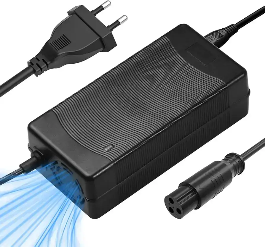 El cargador de 54.6V 2A es el estándar específico para cargar baterías de litio de 48V (compuestas por 13 celdas en serie o 13S), ya que 54.6V es el voltaje máximo de carga necesario para estas baterías.