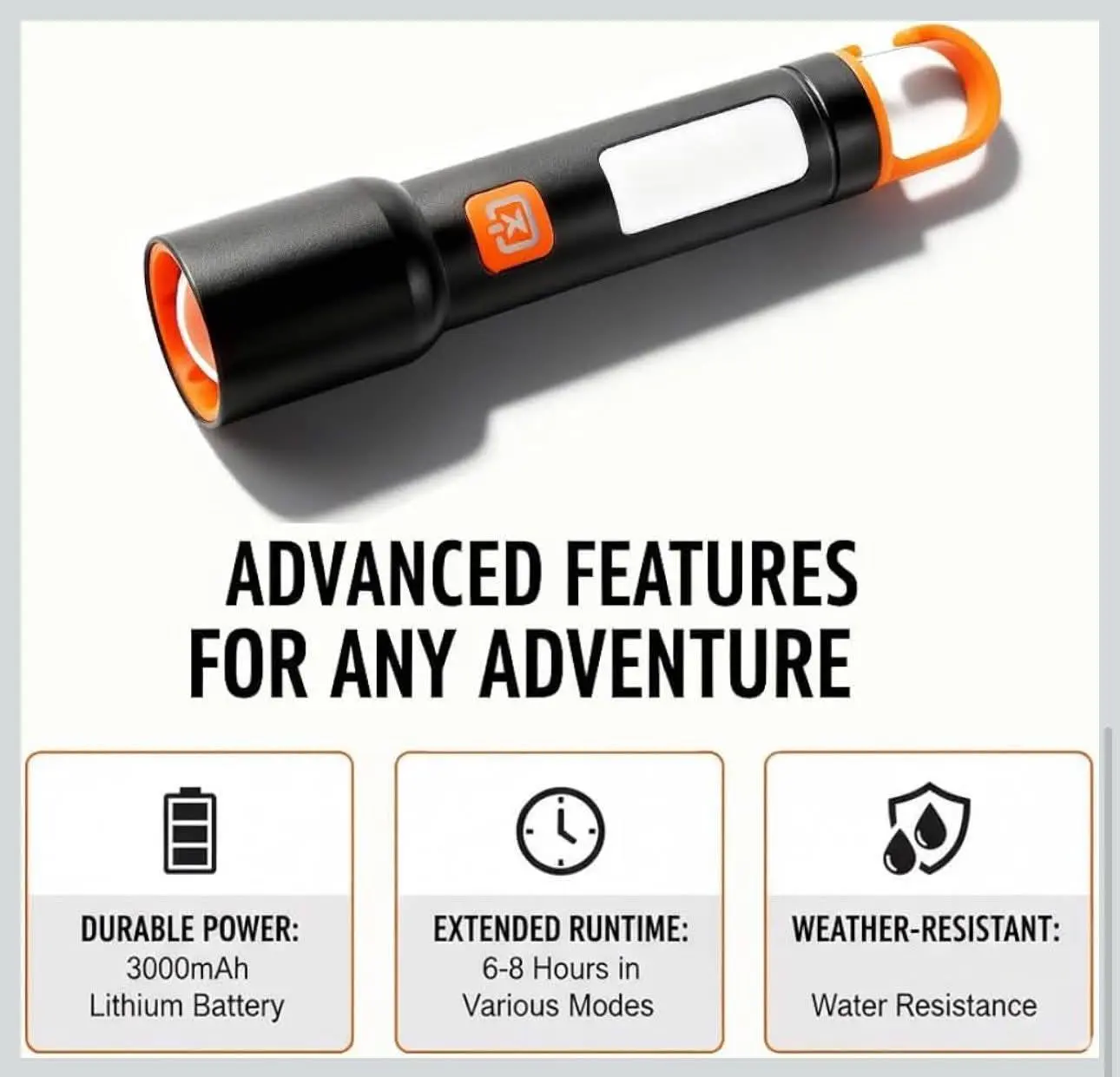 - Zoom Telescópico: Permite ajustar el enfoque del haz de luz, pasando de un punto concentrado para larga distancia a una luz amplia para iluminar áreas cercanas.